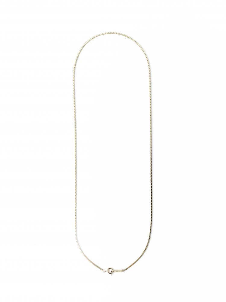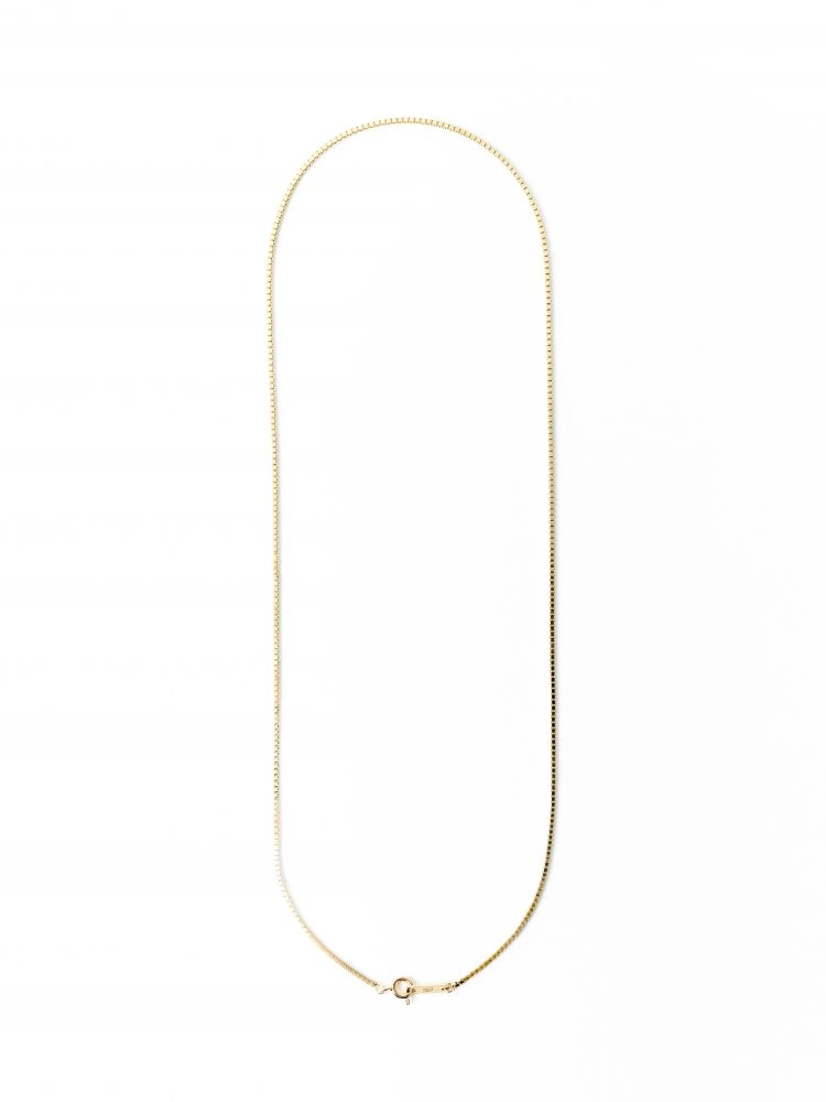 정사각형 기둥 형태의 체인이 촘촘히 연결되어 시크한 무드를 자아내는 14k 골드 체인입니다.